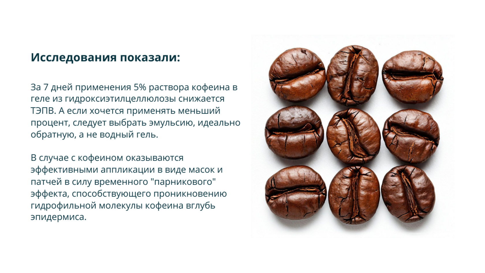 Кофеин - антиоксидант и участвует в сборе (нейтрализации) пероксидных и алкоксильных радикалов, которые образуются под влиянием УФ-лучей. Значит, он справедливо помогает защищать клетки от UV-повреждений. Только важно помнить, что он не работает как солнцезащитный фильтр.